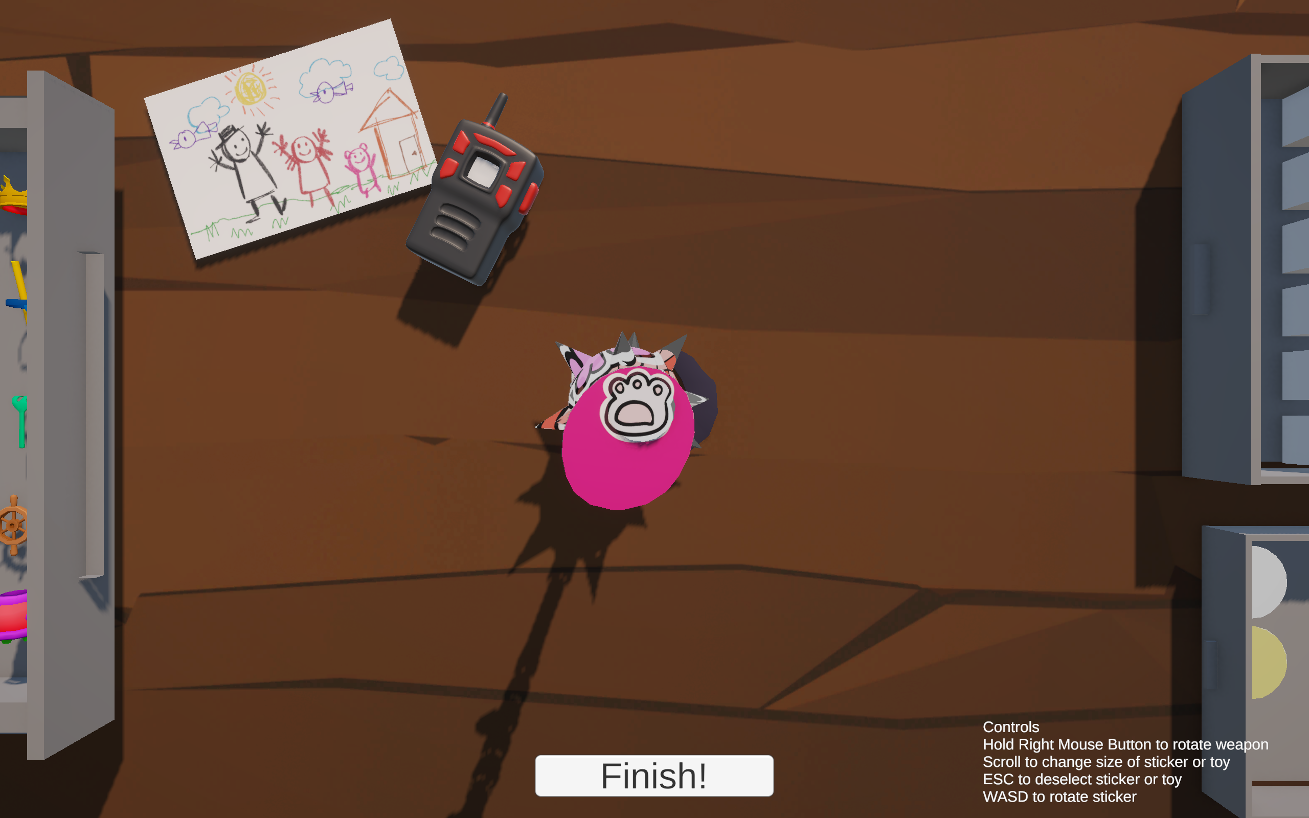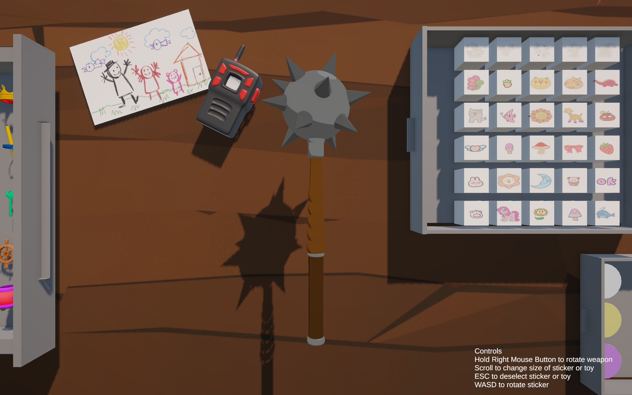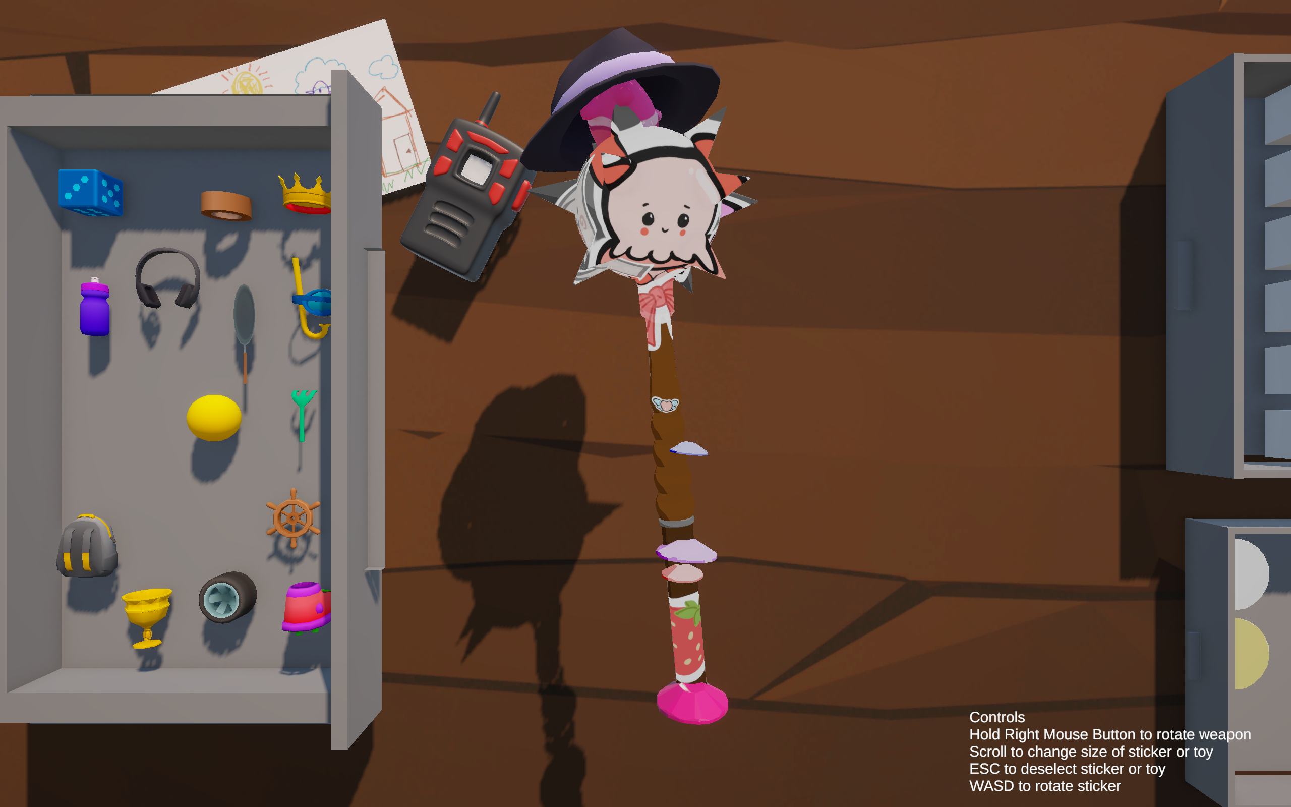 You’re a 5-year old girl, breaking into your dad’s office and making his special tools pretty as a surprise. To follow the theme, you are putting cute things, like stickers and toys, onto something that isn’t cute, a weapon.